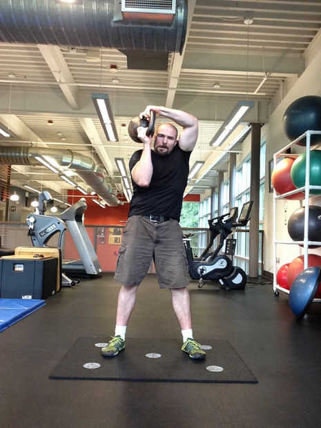 - Gire el kettlebell alrededor de su cabeza, manteniendo los codos apretada y estrecha. Los codos deben ser ángulos de 90 grados en todo momento. El kettlebell es detrás de la cabeza, será bola abajo, mango para arriba.