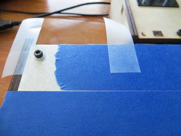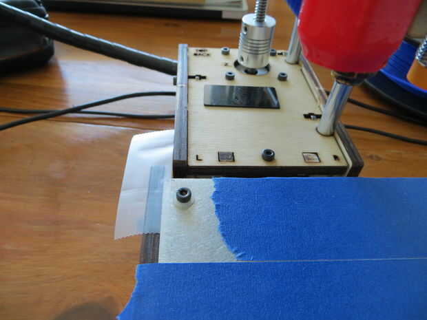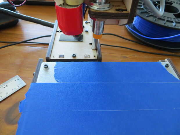 Tome un pedazo de cinta (la cinta menos flexible se prefiere, para no hundirse) y colóquelo en el printerbed paralelo a otro punto de la impresora que no se mueva al mover el eje x. (Foto 2)