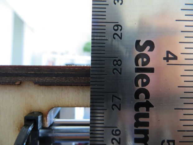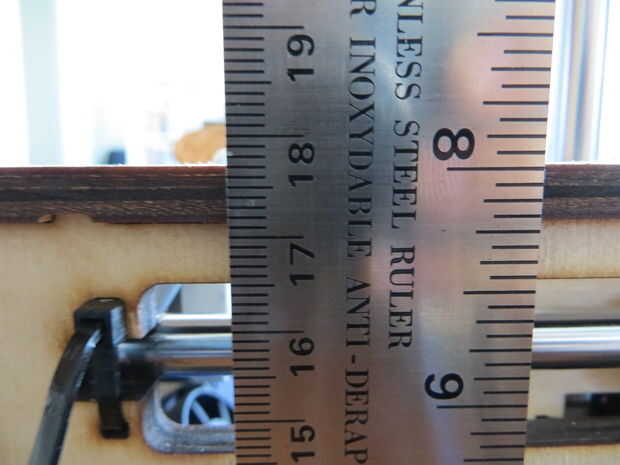 En lugar de utilizar los calibradores de digitales para el eje z, utilizaremos una regla. Primero inicio sus ejes XY y Z. A continuación puso su regla perpendicular a su printbed, junto a la impresora. Mueva el ojo para que esté nivelado con la impresora y hacer nota de un punto particular de la impresora (me gusta usar la parte más alta del brazo de impresoras). Asegúrese de que cuando usted toma sus medidas, su ojo es el nivel con el punto de su medición. Me mide 17,7 cm. Ahora dígale a su impresora para recaudar 100mm. Echa un vistazo a cuánto realmente ha movido su impresora. Mina se trasladó a unos cm 27,75. Si restamos la segunda medición de la primera (27,75-17.7 cm) tenemos 10,05 cm o mm 100,5. Así que un poco hemos sobrepasó la meta de 100mm.