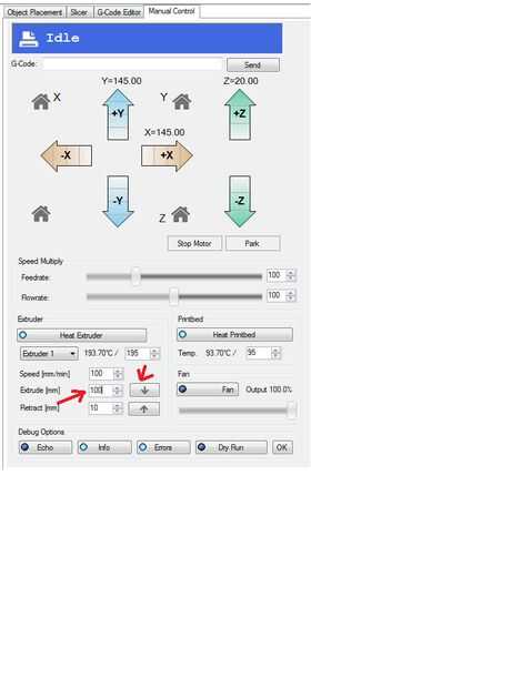 Sacar longitud a 100 y haga clic en la flecha hacia abajo.  Si todo está funcionando correctamente la marca superior que es de 100 mm por encima la marca inferior debe ser alineada con la parte superior de la extrusora.