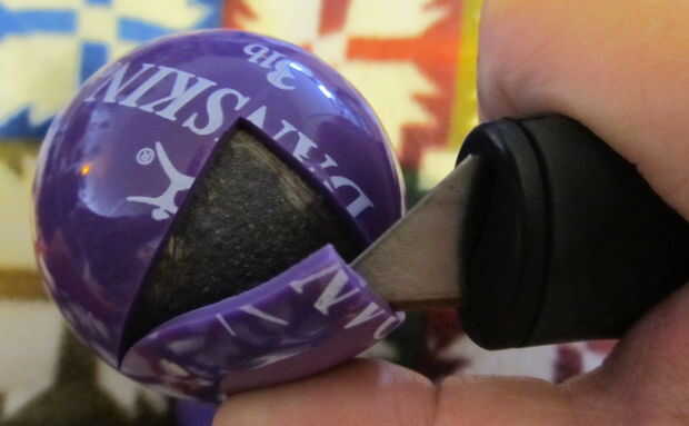 Utiliza el Cúter para cortar cuidadosamente a través de la capa de goma.  Trate de no rayar el metal por debajo.  Usted puede rasgar el revestimiento muy fácilmente, así que no necesitas cortar completamente a través de él todo el tiempo.