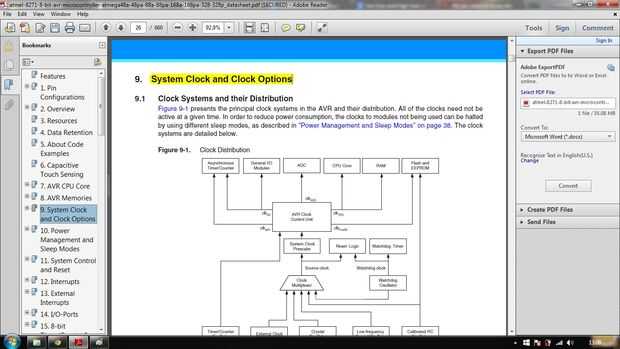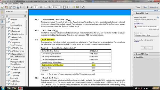 Los chips ATmega pueden funcionar a diferentes velocidades o frecuencias y la frecuencia está determinada por la fuente de reloj que se utiliza. La fuente de reloj se establece mediante la CKSEL3... fusible 0 bits. Para trabajar con la fuente de reloj interna necesitamos establecer CLSEL3 = 0, CKSEL2 = 0, CKSEL1 = 1 y CKSEL0 = 0. Usted tiene que encontrar este valor en la hoja de datos del microcontrolador. En la hoja de datos hay un capítulo "reloj del sistema y opciones de reloj". Hay un subtema en ese capítulo "Fuentes de reloj". Allí encontrarás una tabla donde el valor de CKSEL3... 0 puede ser fuente. He adjuntado una captura de pantalla de la hoja de datos.