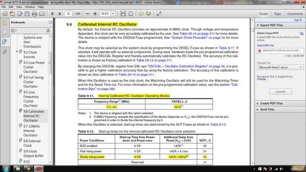 Para el tiempo de inicio hay otro subtema "calibrado RC oscilador interno". Allí encontrarás otra tabla para el SUT0... 1. voy a la opción de poder levantamiento lento. Así SUT1 = 1 y SUT0 = 0.