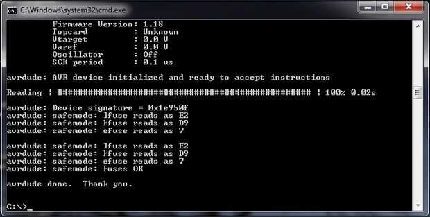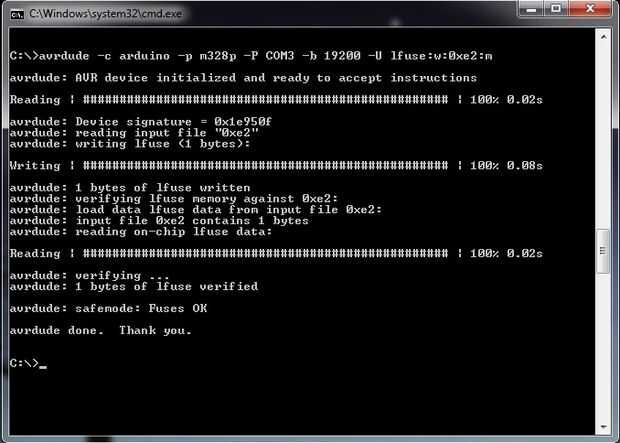 Otra vez, escriba el comando "avrdude - c arduino -p m328p -P COM3 -b 19200 - v" y comprobar si han cambiado correctamente los fusibles.