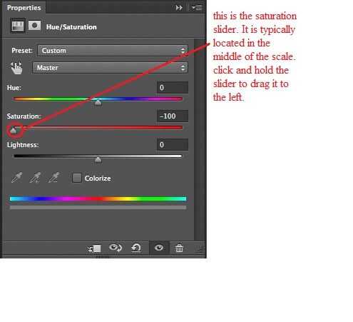 Mantener clic izquierdo en el regulador de saturación (el triángulo gris) y deslícelo hacia la izquierda. Esto eliminará toda la saturación de color de la foto.