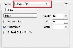 En la ventana 'Guardar para Web', compruebe si la opción presente se establece a' JPEG'. Si no haga clic en la flecha hacia abajo en la opción preestablecida y seleccione la opción 'JPEG alta'.