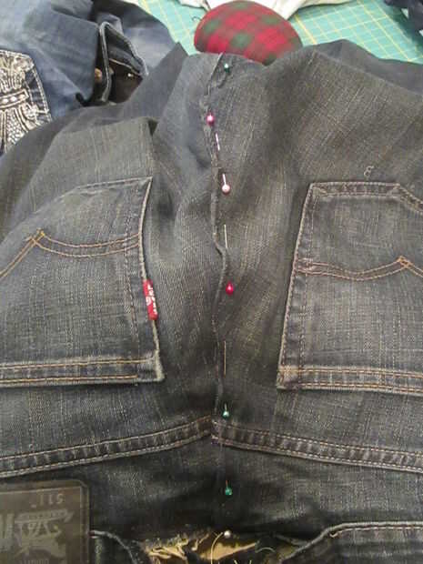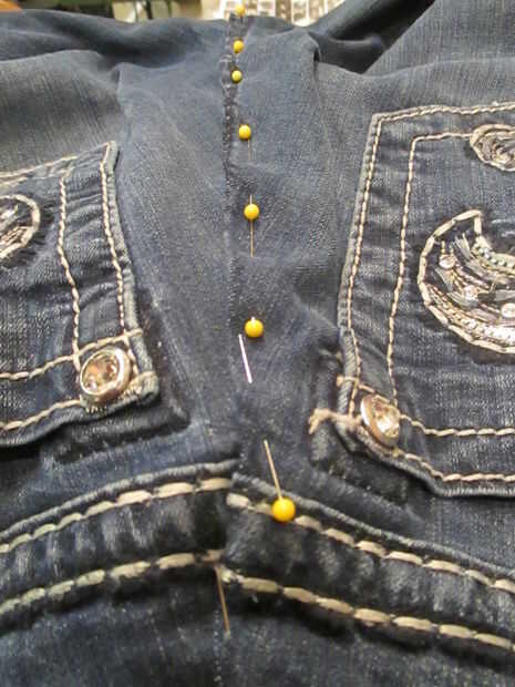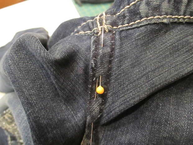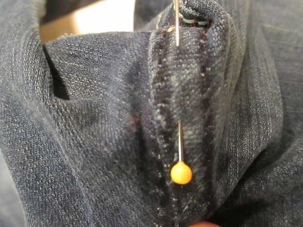 - PIN en el medio, cogiendo todas las 4 capas (esto es importante). Cara en el sentido que he indicado; serán más fáciles de sacar como coser. Este principio realmente no cambian el tamaño, pero asegúrese de que su doble trata de largo suficiente para cubrir los agujeros de costuras antiguo. Esto indica que se encuentra en pista. Continuar trabajando su manera para arriba, prestando atención a sus nuevos pliegues que usted oprimió que definen su costura 3/8" y no el viejo pliegues/las costuras.