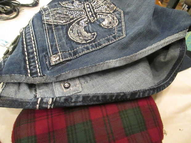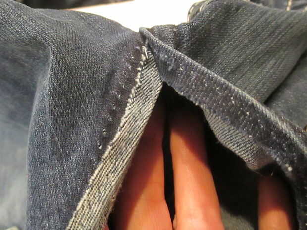 - Ahora, a partir de la costura de la entrepierna, Coloque la tapa superior en el pliegue inferior, ligeramente superpuestos el borde por una buena 1/8". (técnicamente una costura plana-fell obtiene intercalada dentro de unos a otros, pero te enloquecerán tratando de hacer. Pruébalo si quieres... ¡ buena suerte y divertirse! Este método funciona igual de bien.)