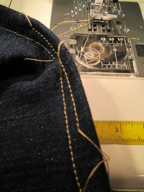- montar los siguientes: hilo de rosca grueso del mismo color que los pantalones vaqueros usados, un nuevo de pantalones vaqueros de la aguja, algunos desechos jean telay un vacío bobina. Y tal vez un martillo. Usted encontrará que golpeando abajo algunas costuras abultadas maravillas!