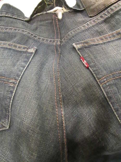 - Pantalones de deslizarse bajo el prensatelas pie hasta que la aguja esté justo por encima y un poco delante de la entrepierna horizontal. Verifique que esté área de costura debajo de la parte delantera de los pantalones. Queremos que cosa dobla, borde exterior primero. Aguja de baja.