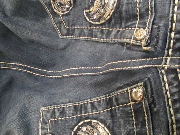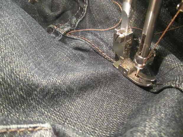 - Al empezar a coser, retire la aguja que está subiendo. Siga cosiendo, haciendo su mejor para coser 1/16 del borde doblado como perfeccionar una línea que pueda. Cuando usted cabeza vuelta hacia el sur se trata de su línea de guía que se puede solo línea tu pie prensatelas para una anchura constante. Los jeans Miss Me tenían un muy de largo doble puntada, así que cuando llegué a la parte superior de los pantalones me dirigí de nuevo hacia abajo otra vez, entonces fue a través de 3/8" para empezar a coser la otra línea paralela. No se olvide de mirar debajo para asegurar que underfolded borde todavía se dobla en lugar. Empezar a coser hacia arriba de los pantalones, usando el pie prensatelas su prensatelas como guía para mantener las dos líneas tan paralelo como sea posible. Mi máquina es una puntada recta por lo que no puedo ajustar la posición de la aguja, pero no dude en ajustar la suya para que el pie se encuentra al ras contra la primera línea. (Alternativamente, usted podría haber parado y volcó los pantalones y cosido por dentro para mejor coser el borde de la underfold, pero la puntada de la bobina no puede ser el mismo como la puntada de la aguja.) Si planchar y cubrió bien debe coger todo muy bien.
