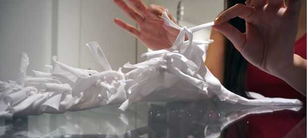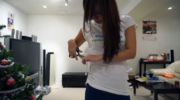 Si usted lleva la camisa y es bueno para ir, puede iniciar doble anudar todo muy bien. No tan estrecha como sea posible porque no quiere deshacer posteriormente. Como haces esto, puede tomar un par de tijeras y corte de los extremos, quitar las borlas.