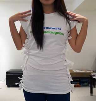Nudo ligeramente doble las pestañas a ambos lados de la camiseta. Una vez que termines, probar la camisa para asegurarse de que encaja correctamente. Ten cuidado que estás usando las lengüetas correspondientes derecho porque no quieren saltar sobre una ficha de un lado y convertirlo en irregular. Si esto sucede, deberás desatar los nudos y rehacerlo hasta encontrar la ficha que falta.
