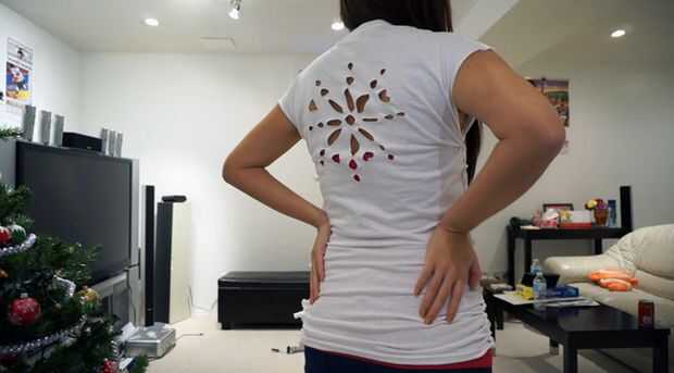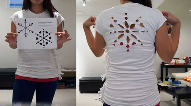 Una vez que hayas impreso la plantilla, dóblalo por la mitad, alineando los dos copos de nieve. Doblé la plantilla de papel por la mitad porque estoy doblando a la tela que voy a cortar por la mitad también. Así que en lugar de recortar un círculo completo en el medio, yo soy recortar un semicírculo. Esto ayuda a mantener las cosas simétricas. Sólo utiliza la plantilla como un punto de referencia y cortar las formas a mano alzada. Puede hacer el copo de nieve más grande o más pequeño si desea y uno grande, uno pequeño o hacer un poco más. Pero básicamente, tómese su tiempo y corte la forma doblando la tela de la camiseta por la mitad en el lugar que desea cortar.