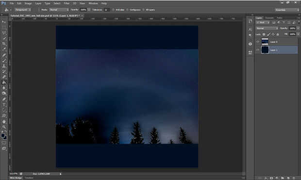 Ahora, debemos color nuestra capa vacía para el color de la franja deseada. Para hacer un color plano a lo largo de toda la capa (como se muestra), simplemente seleccione la herramienta Cubo de pintura (llave G) luego haga clic en cualquier lugar dentro del espacio de trabajo del documento. Asegúrese de que usted está trabajando en la capa de fondo y no la imagen misma. Si no aparece el color, es muy probable que usted no está usando la herramienta Cubo de pintura, sino más bien la herramienta de degradado. En este caso, simplemente haga clic en shift-G hasta que se seleccione la herramienta Cubo de pintura, o haga clic izquierdo en la herramienta de degradado en el panel de herramientas y seleccione cubo de pintura.
