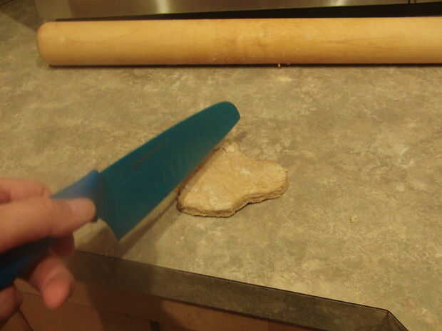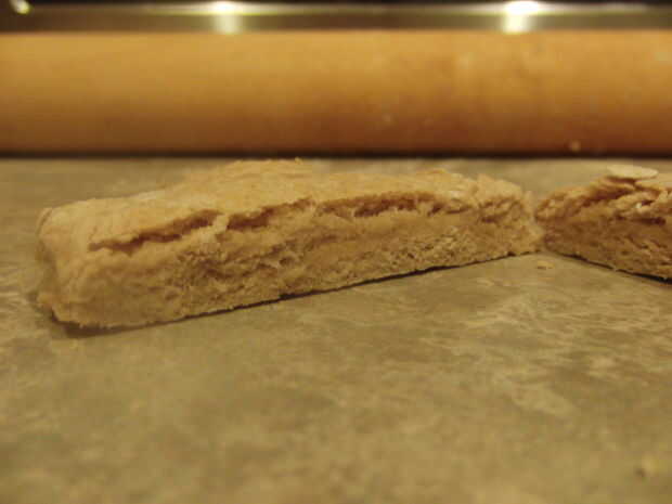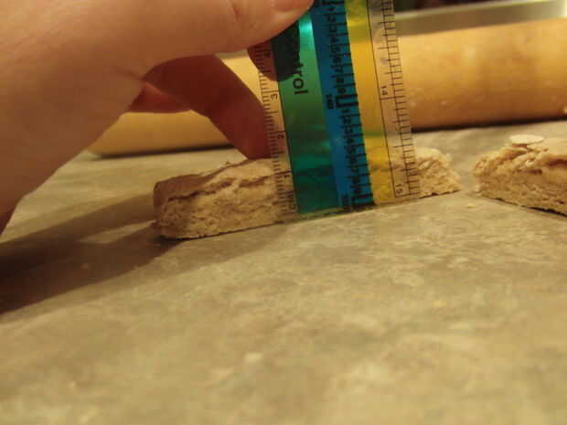 Después de la cocción, uno de los lotes de mantequilla cortadas por la mitad y mide el espesor seccional cruzado de la galleta. La galleta había ha desplegado a 0,5 cm de espesor antes de hornear.