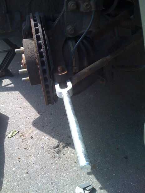 En este punto, puede utilizar una llave de 19mm y un par de Vice grips para quitar la varilla de conexión externa. Garantizar las empuñaduras de mordaza a las partes planas de la varilla de conexión externa, utilice la llave para aflojar la tuerca de bloqueo y desenroscar la varilla de conexión externa. Contar o marcar los hilos. Si sólo estaban haciendo el tirante externo, usted debería hacerse aquí.