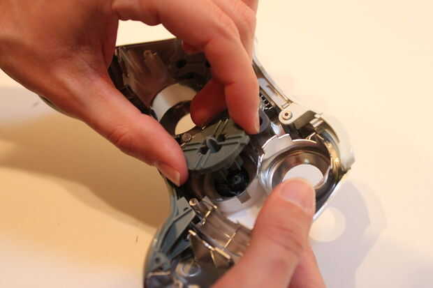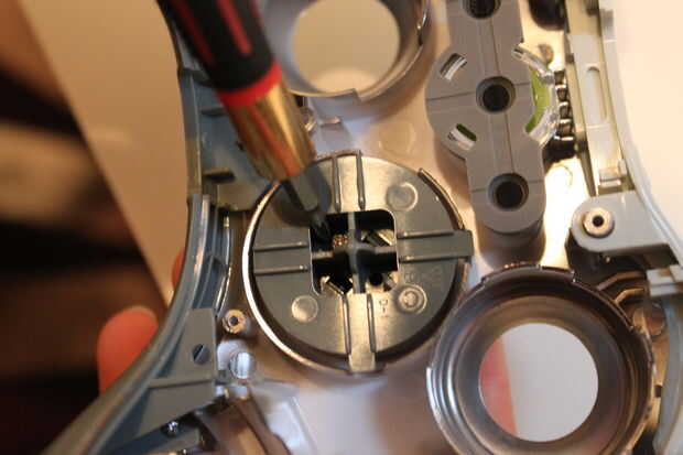 2) Utilice los dos tornillos de plata brillantes que originalmente ligan el d-pad y colocarlos en los agujeros apropiados.
