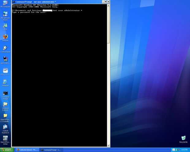 todo lo que tienes que hacerlo abra símbolo del sistema, para ello, haga clic en Inicio, luego ejecutar. En el cuadro, escriba cmd. Esto debería abrir una ventana negra. En esta ventana, escribe administrador de usuario de red *. (sin periodo). puede sustituir la parte de administrador con cualquier nombre de usuario que te gusta. Si usted quiere hacer esto en la escuela, sin embargo, necesita apagar el ordenador y luego volver, y antes de que llegue a la pantalla de login, tienes que mantener presionada la tecla f8. Esto lleva a un menú de arranque (lo sentimos, no hay imágenes), y seleccione Inicio en mod seguro (con el símbolo del sistema). Entonces, usted puede hacer esto. Si todavía no le utilice el comando ejecutar (que en las escuelas generalmente no a menos que usted inicie en modo seguro), usted tendrá que encontrar una manera de abrir cmd, (comando pronto en caso de no has averiguado que todavía). El resto funciona del mismo modo, la mayoría tiene problemas tratando de abrir cmd. Después de que has escrito en una contraseña nueva, puede almacenar registro en cuenta de la persona cuya contraseña ha cambiado. Oh y tratar de no dejar que la persona que posee la captura cuenta niños.