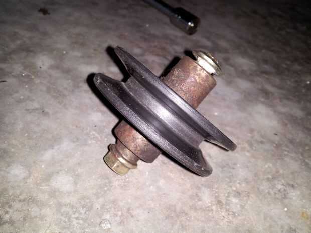 La correa está atrapada entre esta loca poco y el marco en el lado izquierdo de la máquina así que necesitarás quitarla. Utilice una toma de 13mm para aflojar la tuerca y tratar de no perder el casquillo que enlaza el muelle a. Puede llegar a la cabeza del perno para tirar hacia arriba y hacia fuera alcanzando a través de la abertura donde se encuentra el engranaje de sector dirección.