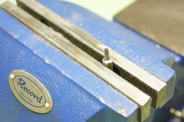 Si tienes un vicio, abrazadera de uno de los pedacitos torx firmemente en su lugar como muestra la imagen. Si no tienes un vicio, puede utilizar una abrazadera en c o vice grips para fijar la broca en el borde de una mesa.