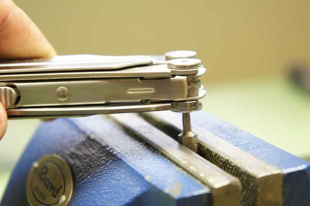 La herramienta está montada con un pasador (una cabeza de tornillo y un eje que se extienden a través de la herramienta) y un tornillo que se conecta en el otro lado. Para el desmontaje más fácil, usted querrá mantener el pin sigue girando el tornillo. En herramientas de óxido negro, Leatherman utiliza liberalmente el loctite y esto es una necesidad, no una recomendada.