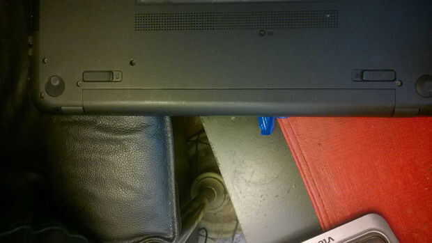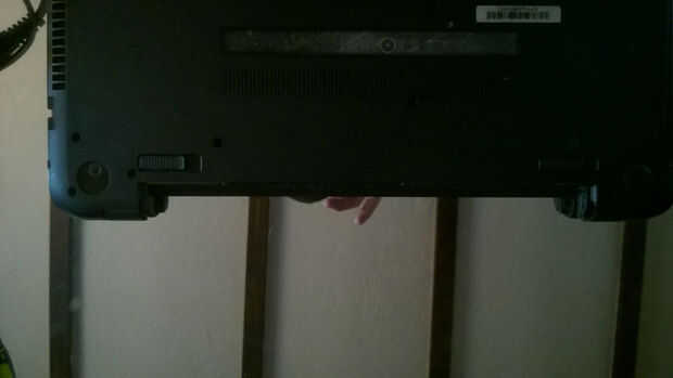 3. La batería va a salir fácilmente. Ponerlo en una superficie seca fresca lejos de todo lo que posee una carga eléctrica o estática que puede dañarlo. (Foto 2 mostrará un netbook con la batería quitada).
