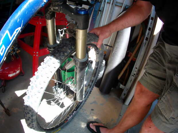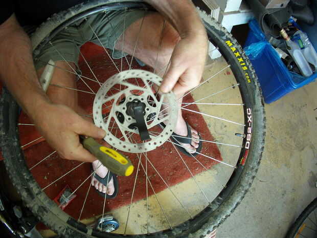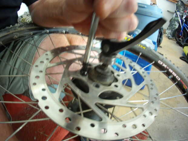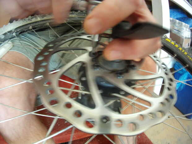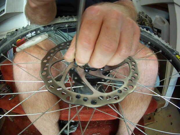 Una vez que el disco está apagado Coloque uno nuevo en su lugar y primera mano apriete todos los tornillos en el mismo patrón. Entonces si tienes una llave dinamométrica correctamente Coloque en 40-60 libras. Para establecer el comienzo de la llave por las Naciones Unidas haciendo la llave totalmente y luego atornillar el mango hasta en algún lugar entre 40-60 en libras (no pies lbs). Si no tienes una llave de torsión (o no puede ir a 60 en lbs) hacer todo lo posible para apretar todos los tornillos uniformemente. Una vez que todos los tornillos son la rueda puede colocarse en el tenedor y el lanzamiento rápido puede apretarse. Coger la bicicleta para una prueba de funcionamiento y hacer que los frenos estén funcionando, confía en mí encontrar en la parte superior de la colina es mucho peor.