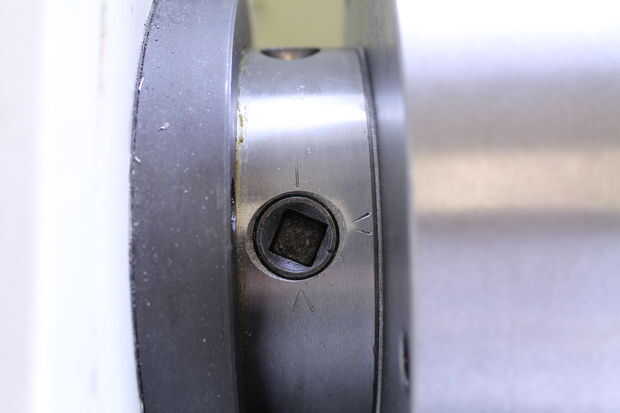 Hay tres marcas al lado de estos pernos, una línea recta y dos V Estas marcas, así como la ranura en el perno se utiliza para decir si el mandril está conectado o no. Como en la imagen, cuando la muesca está entre las dos V el portabrocas está apretado correctamente. La ranura puede cambiar exactamente donde se encuentra entre estos dos V pero mientras sea entre ellos, el portabrocas se monta correctamente. Para aflojar los tornillos y retire el portabrocas usted gire el tornillo en sentido horario hasta que la ranura se alinea con la línea recta. Cuando la ranura en el perno y la línea recta están en la alineación y el mandril puede extraerse el torno. Mandriles (Chucks) es algo pesados y si tienes dudas que podría caer el portabrocas utilizan algo como un pedazo de madera para proteger las formas o a tomar algo para descansar el portabrocas en cuando se retire. Una vez que han protegido las maneras puede utilizar un martillo de latón para afl ojar el mandril y luego tire de ella.