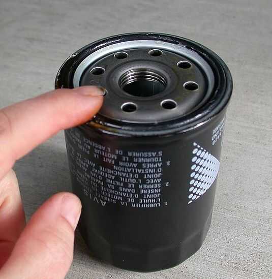 Ahora que han quitado el drenaje del filtro de aceite el resto del aceite en el filtro viejo hacia la bandeja recolectora. Coge el filtro nuevo y un cuarto de aceite. Abrir el cuarto de aceite y usar el dedo para conseguir un toque de aceite hacia fuera así que puede ser utilizado para lubricar la Junta del filtro. La foto de arriba señala el empaque negro que necesita la lubricación. Es aceptable utilizar las manos como no sufra alguna lesión de este paso pero los guantes son también una opción si no le gusta ensuciarse. Una vez que el filtro ha sido lo engrasado su tiempo para la instalación del filtro nuevo. Cómo firmemente el filtro se pone encendido en este paso es importante porque si su floja se derramará aceite pero si su demasiado apretado puede filtrar suficiente aceite así que es imperativo que el filtro apenas sobre la mano no está permitiendo que las vibraciones del motor al traqueteo.