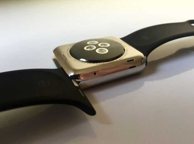 Con el otro lado del reloj sigue frente a usted, deslice la banda ya con los orificios de ajuste en la parte inferior del reloj de Apple y la banda más corta con el lazo en la parte superior del dispositivo.