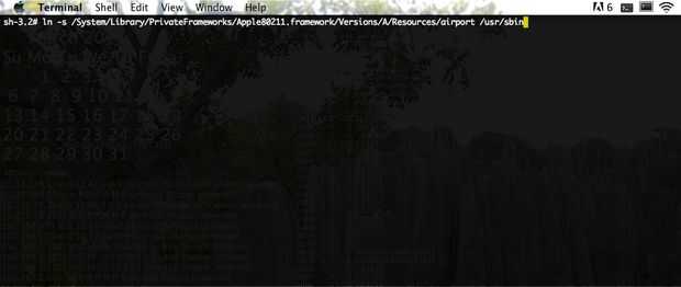 ln -s /System/Library/PrivateFrameworks/Apple80211.framework/Versions/A/Resources/airport/usr/sbin
