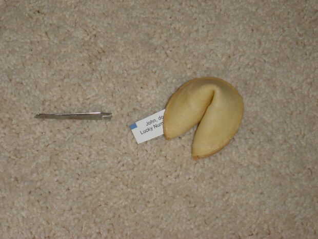 Tome las pinzas, agarra la mano de la fortuna y deslícela a través del orificio más grande en la cookie. Esto puede ser un poco más difícil.