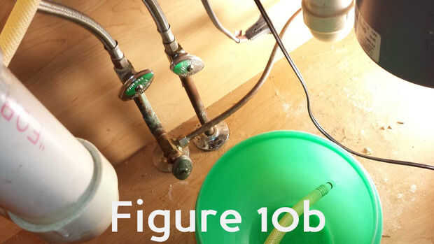 Saque la manguera de la parte superior del fregadero de la cocina (figura 10a) y descansar en un recipiente debajo del fregadero (figura 10b).