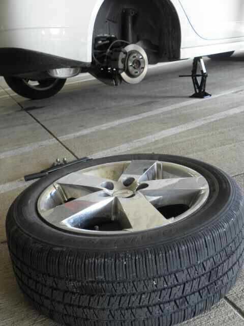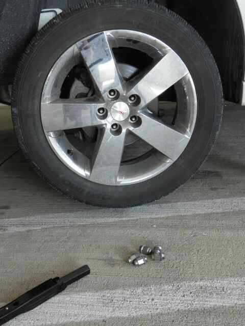 Con el vehículo levantados 2-3 pulgadas del suelo quitar completamente las tuercas del estirón de la rueda.