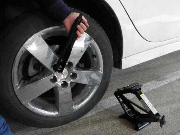 Bajar el coche de la toma para que el peso total del vehículo se aplica sobre la llanta de repuesto.