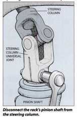 Si estás reutilizando los viejos extremos de barra de lazo externo, no quitar los nudillos con un removedor de horquilla tipo — van destruir los sellos de grasa. Utilice un removedor de tipo tirador. Mejor aún, usted probablemente puede dejarlos en los montantes. Simplemente afloje las tuercas y gire los tirantes con una llave de tubo. Las varillas se desenrosque de los extremos, hacia la derecha por un lado, hacia la izquierda por el otro. Desatornillar la rejilla del chasis. Ahora puede desconectar las líneas fluidas y capturar el líquido hidráulico de dirección asistida como drena.