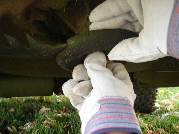 Salir gateando por debajo de la cubierta del cortacéspedes de césped y colocar las piezas en un lugar seguro