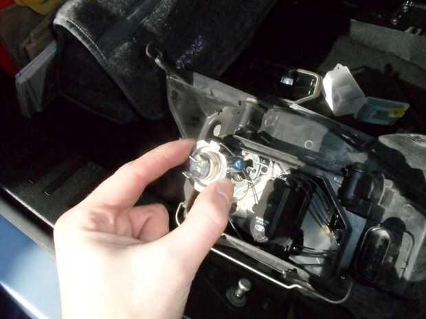 Tomar la nueva bombilla por la carcasa de metal, no toque el vidrio. Acople al conector cuadrado de energía negra que todavía debe ser aprobado a través del bucle de clip de metal. Ahora coloque la bombilla en el faro.