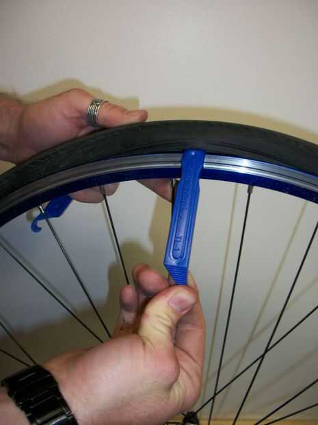 d. mediante la palanca de tercer deslícelo alrededor entre la rueda y el neumático hasta que un lado del neumático es completamente separado de la rueda.