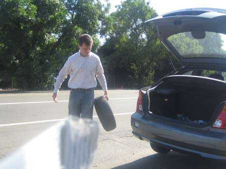 Coloque el neumático viejo y herramientas en su tronco. Vuelva a verificar para asegurarse de que no dejas ninguna herramienta.