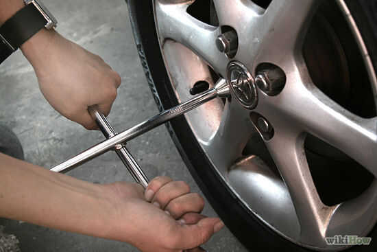 Puede que necesite soltar la rueda. No retire las tuercas del estirón en este punto; simplemente afloje los girando la llave hacia la izquierda (sentido antihorario). Si las tuercas están muy apretadas, trate de colocar la llave en la tuerca y en el brazo de la llave a utilizar todo su peso en él.