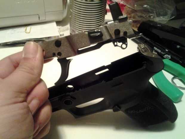Bien, ahora el corazón de la plataforma de la P250 FCA serializada. La pieza que se mueve entre calibres y tamaños. Para quitar la FCA localizar el desmontaje de palanca se utiliza para quitar la corredera y eliminar de la estructura. Ahora Levante la parte delantera de la FCA del marco. Coloque su dedo pulgar en el percutor y dibujar por lo que el gatillo puede borrar el marco como eliminas la FCA. Allí usted tiene la única pieza serializada al arma todas las otras piezas son accesorios intercambiables.