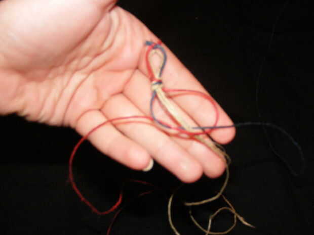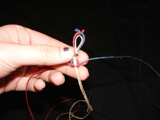 OK, ahora me swiched a dos diferentes colores de filamentos largos para hacer este esier a ver. por ser simple empezaremos con la hebra derecha, (uno rojo) colocar la hebra derecha sobre el centro dos y debajo de la hebra izquierda, formando un lazo grande en el lado derecho. luego tomar la hebra izquierda (uno azul) y colóquelo sobre el rojo, en el medio dos y luego a través del lazo creado por el filamento rojo. Ahora debería verse como la segunda foto. el filamento rojo viene a través del bucle de la hebra de bule y el filamento azul a través del bucle de la hebra roja. el azul suele ser debajo de la media dos y el rojo