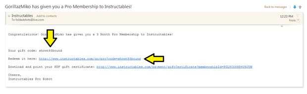 Para canjear tu regalo de membresía de Instructables Pro, simplemente introduzca su código de redención de regalo que recibió en su correo electrónico en el cuadro de texto en la dirección a continuación y presione Enviar.