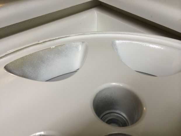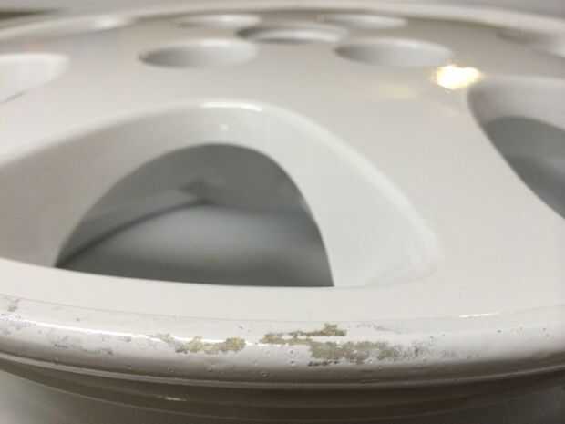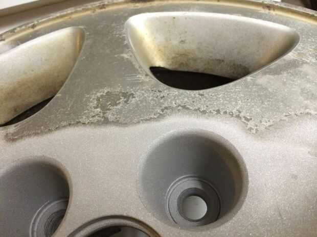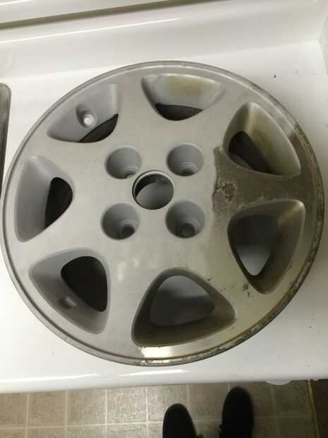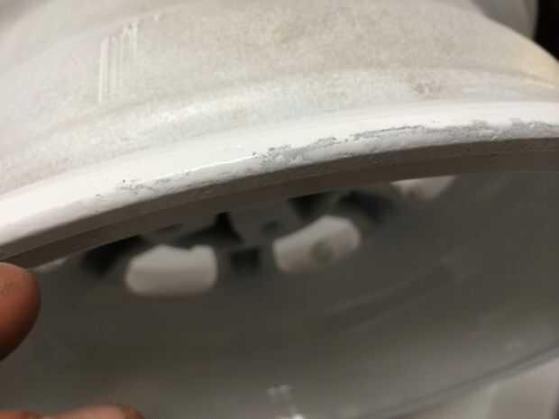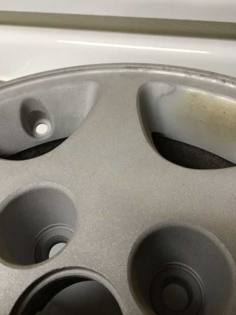 he aprendido a través de ensayo y error que chorreo de arena es el paso más importante del proceso. Mientras que es más importante en la cara de la rueda de chorreo de arena, te recomiendo va sobre la rueda toda bien. Mi primer error fue que yo había no completamente con chorro de arena alrededor del borde externo de la llanta dejando la capa transparente de fábrica y por lo tanto, un defecto visible, como se ve en la foto de abajo. Mi segundo error se produjo cuando no había notado que la fábrica tenía pintura de plata en los agujeros de los radios, mientras que el rostro estaba cubierto por una capa transparente. La capa clara sale mucho más fácil que la pintura y si la pintura es de plata es difícil de notar. Tomé fotos claro para ayudar a identificar el problema. Asegúrese de que se recorren cada centímetro de la rueda para eliminar toda la pintura superficial y capa clara antes de comenzar el paso de la capa del polvo o el polvo no atraerá a la rueda. Cuanto más tiempo pongo en chorro de arena, la mejor calidad del acabado.
