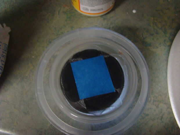 Un pedazo de la cinta de pintor azul encima de la tapa para cubrir el panel solar.  Va cubriendo el frasco con sales de Epsom y desea mantener la zona de panel solar claro que puede absorber la energía de los soles.