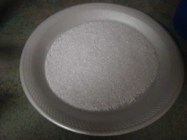 Verter algunos cristales de sales de Epsom en la placa de papel/de la espuma.  En este punto, si desea que puede Agregar un par de gotas de alimentos para colorear, utilizando cualquier color usted elegir.  Utilice una cuchara para mezclar bien.