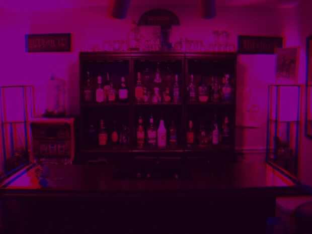 Aquí le damos la misma imagen de mi bar como una imagen de anaglifo rojo/azul. Tenga en cuenta que como son retirar 66% del color de la imagen, usted también necesitará hasta el brillo antes de quitar el color en el orden de la imagen sea visible sin ser demasiado oscura. Por desgracia, mi barra estaba oscuro para empezar, así que probablemente no el candidato ideal para la fotografía 3D para comenzar con. Lo siento. :/