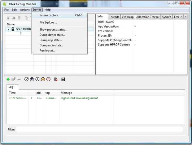 Seleccione su teléfono Android en el panel izquierdo, luego ir a la barra de menús y la barra de menú Seleccione dispositivo > Capturar pantalla.